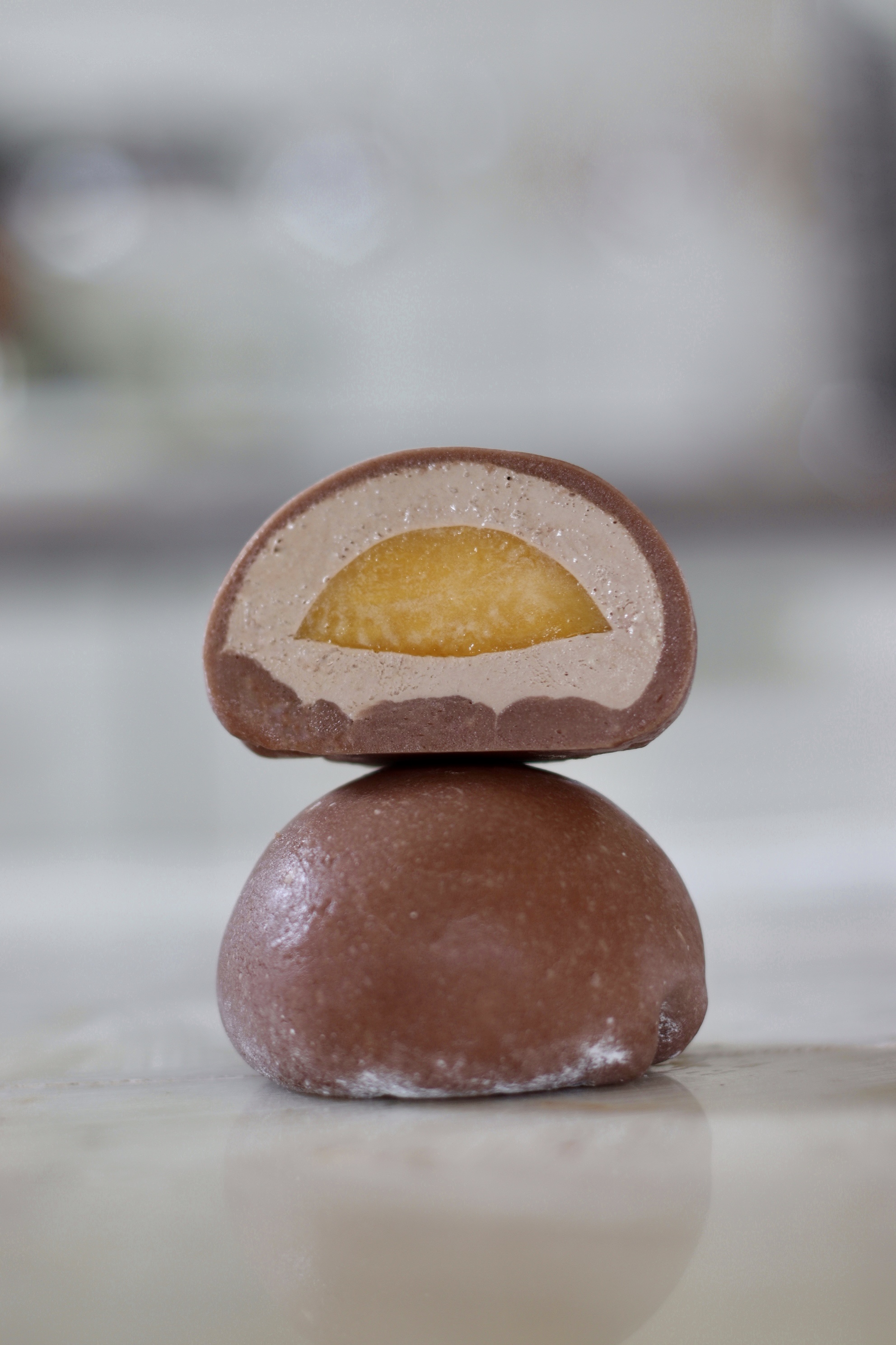 6. На тесто из кондитерского мешка отсаживаем 20 г крема. Утапливаем в нем полусферу из компоте манго и сверху отсаживаем еще 10 г. Закрываем моти.